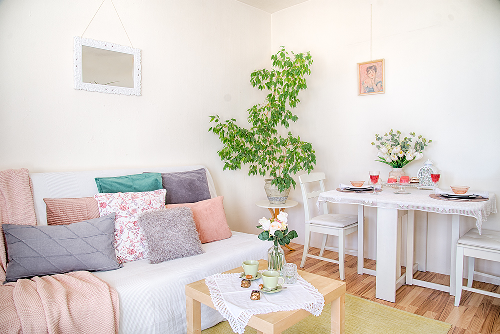 Mivel a nagyobb átalakításra nem volt forrás, ezért a tereket elsősorban megszabadítottuk a túlzsúfoltság érzetétől, majd a meglévő bútorokat a helyiség funkciójának megfelelően átrendeztük, a személyes tárgyakat elpakoltuk és a meglévő bútorok stílusához igazodva alakítottuk ki a vintage hangulatot. A lakás alapvetően jó állapotú volt, viszont az egységes stílus kialakításához szükséges volt néhány új kiegészítőt beszerezni, melynek összköltsége nem volt több 150.000 forintnál.